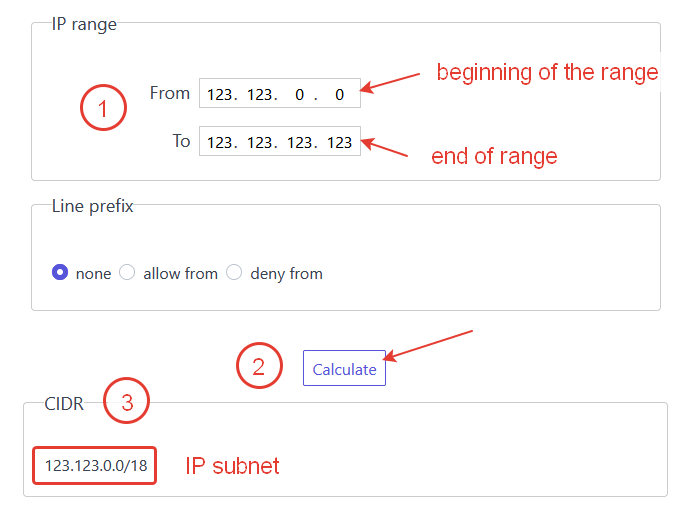 If you need to block not individual IP addresses, but a subnet of IP addresses (a certain range), first determine the desired value using classless addressing CIDR (IP Range calculator in CIDR):