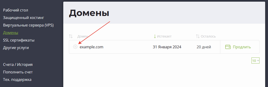 - На странице Домены найдите домен, DNS-записи которого необходимо изменить и нажмите на иконку шестеренки рядом с именем домена: