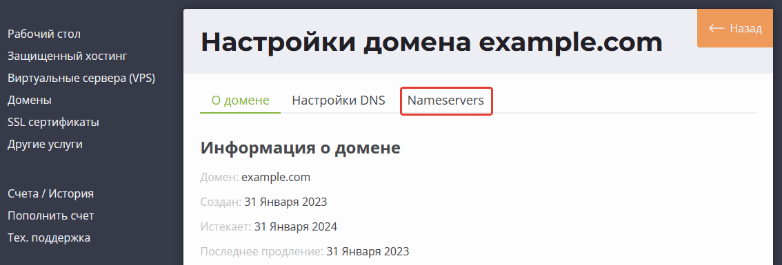 - Перейдите на вкладку Nameservers: