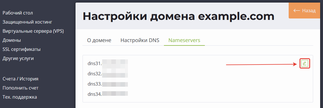 - Нажмите на кнопку Редактировать NS: